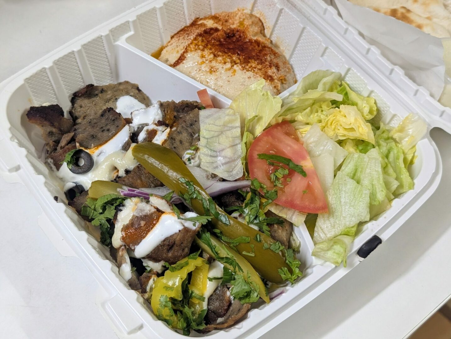 Những lát thịt gyro mềm mại, thơm phức các gia vị của Trung Đông và đầy vị béo của bò, kết hợp với vị béo nồng của nước xốt tỏi rất ngon. Thịt nướng cuốn vào bánh mì với dưa chua và ớt chua, thêm chút xà lách vào không có gì để chê. Thực khách còn có thêm cho thêm chút hummus để có thêm vị thơm bùi với hơi chua vào là còn ngon hơn nữa.