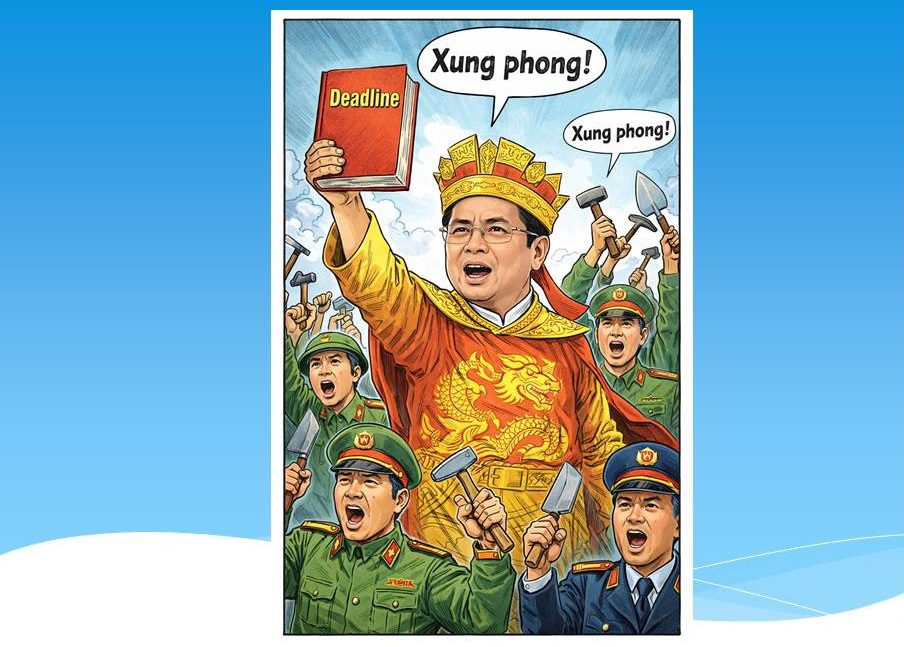 Trong kho tàng văn hóa tếu xứ mình, có một câu thần chú truyền đời cho các vị lãnh đạo: “Phấn đấu hoàn thành.” Câu này linh lắm, lãnh đạo vừa dứt câu là bê tông tự đông cứng không cần thời gian, thợ nề tự mọc thêm ba đầu, sáu tay, lo ba việc trộn vữa, xếp gạch, trát tường cùng một lúc.