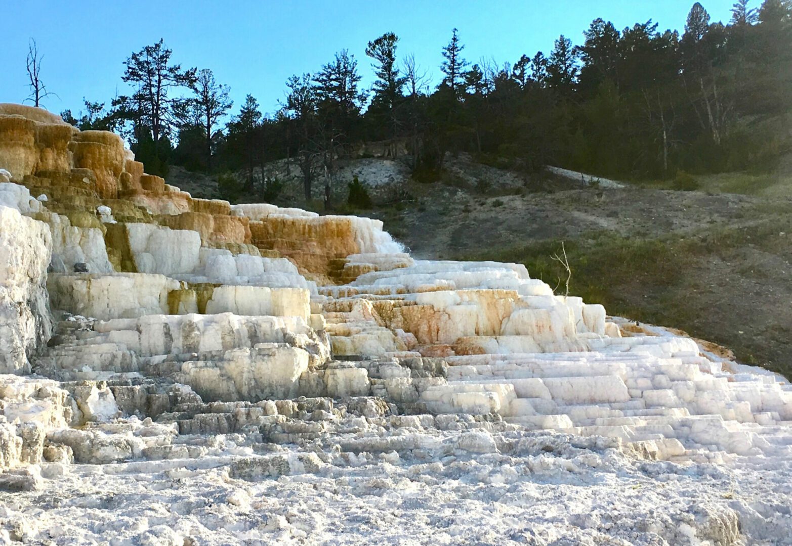 Mammoth Hot Springs là một thắng cảnh rất đẹp trong công viên Yellowstone. Đây là một đồi cao mà phần trên chóp đã bị vạt phẳng. Dòng nước chảy dưới bên dưới lòng đất sâu được “đun nóng” bằng sức nóng địa-nhiệt và tuôn trào lên trên mặt đất. Sự tương duyên pha trộn giữa nước, nhiệt độ dưới lòng đất, không khí lạnh bên trên và đá vôi đã tạo thành một không gian lạ lùng.