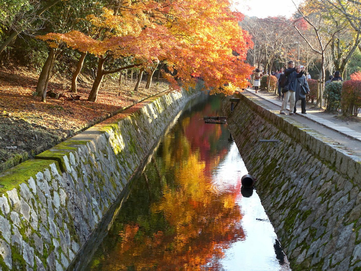 “Con đường Triết Học” không dài lắm, chỉ khoảng 3-4 cây số, nhưng phong cảnh lá phong rực rỡ của các ngôi chùa Ngân Các Tự (chùa Bạc), Nam Thiền Tự, Pháp Nhiên Viện, Vĩnh Quan Đường, Thanh Thủy Tự làm du khách ngẩn ngơ trong suốt cuộc hành trình du ngoạn mùa Thu.