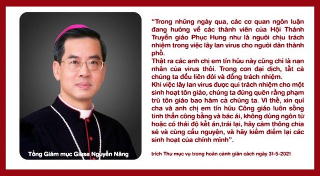 Trước đó, Thư mục vụ của Tòa Tổng giám mục Sài Gòn, ngày 31-5 cũng kêu gọi người Công giáo hãy tỉnh táo trước diễn biến này. Tổng giám mục Nguyễn Năng cũng nói rõ “Trong những ngày qua, các cơ quan ngôn luận đang hướng về các thành viên của Hội Thánh Truyền giáo Phục Hưng như là người chịu trách nhiệm trong việc lây lan virus cho người dân thành phố. Thật ra các anh chị em tín hữu này cũng chỉ là nạn nhân của virus thôi. Trong cơn đại dịch, tất cả chúng ta đều liên đới và đồng trách nhiệm. Khi việc lây lan virus được qui trách nhiệm cho một sinh hoạt tôn giáo, chúng ta đừng quên rằng phạm trù tôn giáo bao hàm cả chúng ta. Vì thế, xin quí cha và anh chị em tín hữu Công giáo luôn sống tinh thần công bằng và bác ái, không dùng ngôn từ hoặc có thái độ kết án, trái lại, hãy cảm thông chia sẻ và cùng cầu nguyện, và hãy kiểm điểm lại các sinh hoạt của chính mình”.