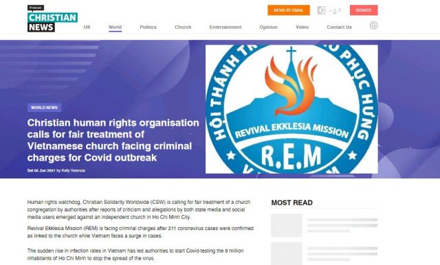 Ngày 5-6-2021, Tổ chức Christian Solidarity Worldwide (CSW – Đoàn kết Cơ đốc giáo trên toàn thế giới) đá phát Thư kêu gọi chính quyền Hà Nội hãy đối xử công bằng với Hội thánh truyền giáo Phục Hưng, hiện đang phải đối mặt với cáo buộc hình sự vì bị coi đã là nguồn lây nhiễm covid-19:“Chúng tôi kêu gọi nhà chức trách đảm bảo rằng bất kỳ giới hạn nào trên cơ sở sức khỏe cộng đồng đều được áp dụng không phân biệt đối xử và chúng không phải là công cụ để làm suy yếu việc hưởng các quyền và tự do cơ bản trong tương lai. Chúng tôi cũng kêu gọi các cơ quan chức năng đảm bảo rằng mọi cuộc điều tra hình sự được thực hiện theo các tiêu chuẩn quốc tế nhằm bảo vệ quyền của những người có liên quan, phù hợp với Công ước Quốc tế về các Quyền Dân sự và Chính trị mà Việt Nam là thành viên”.