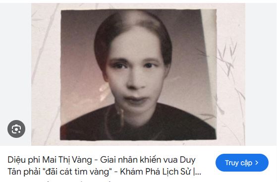 Đệ nhất Giai Phi nguyên danh Mai Thị Vàng sinh năm 1899, tại thôn Kim Long, Huế, năm 1915 đám hỏi, đám cưới ngày 16/1/1916, tức là đầu năm 17 tuổi đám cưới. Cuối năm 17 tuổi phải theo chồng đi đày, 19 tuổi trở về Huế. Khi ở đảo Réunion, Duy Tân vẫn thường gửi thư về cho bà. Năm 1925, Duy Tân đã gửi thư về cho hội đồng hoàng tộc kèm giấy ly hôn bà Mai Diệu phi, xin Hội đồng chứng nhận để bà đi lấy chồng khác. Khi đó, bà mới 27 tuổi nhưng bà không ly hôn mà vẫn ở vậy nuôi mẹ và em chồng. Cô Trà còn cho biết là vua Duy Tân rất thương nhớ bà Phi Mai Thị Vàng. Vua có làm một bài thơ nói lên tâm sự của mình đăng lên báo bên Pháp và ông Trần Viết Ngạc (em người bạn thân của cô Trà) sang bên đó đọc được, và còn đọc thêm một số tài liệu liên quan đến vua Duy Tân và bà Hoàng Phi Mai Thị Vàng bằng tiếng Pháp.