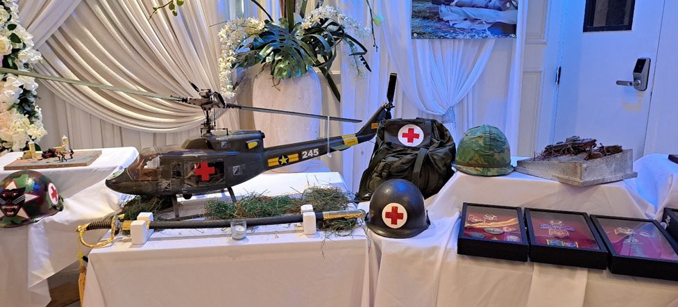 Bức tường bên hông hội trường được dùng làm nơi triển lãm các quân binh chủng, với những phù hiệu, quân trang quân dụng, hình ảnh tài liệu… Góc dành cho Quân Y nằm khiêm tốn nơi bàn cuối, gần cánh phải của sân khấu. Nơi đây có treo một tấm bảng ghi tên 71 quân y-nha-dược sĩ đã hy sinh trong chiến tranh, chết trong trại cải tạo hoặc trên đường tìm tự do. Danh sách này cũng được chiếu lên màn hình trong hai phút mặc niệm, sau nghi lễ chào quốc kỳ và hát quốc ca Việt Nam Cộng Hòa và Hoa Kỳ.