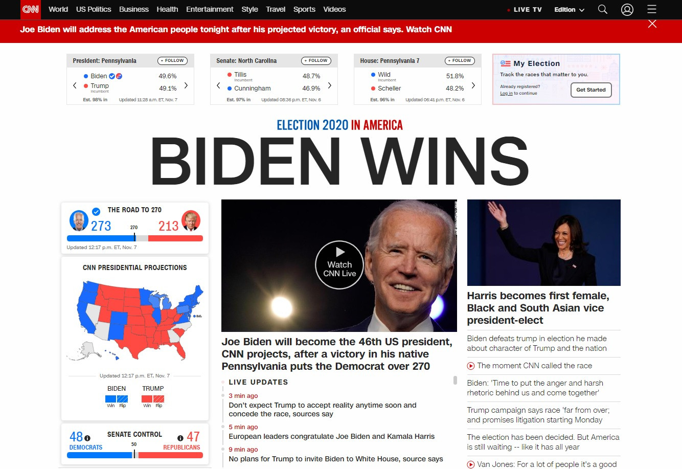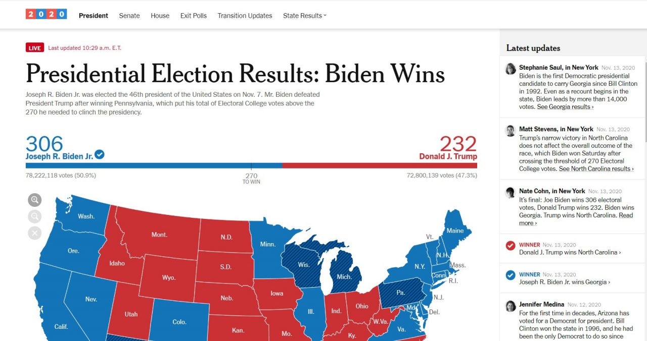 Phó Tổng thống Joe Biden (DC) được dự báo thắng cử tổng thống 2020, theo dự báo chung của ABC News, CNN, Fox News, NBC News và New York Times. Truyền thông đoán, với thắng lợi ở bang Pennsylvania, ông Biden sẽ giành được 273 phiếu cử tri đoàn, vượt qua con số 270 phiếu đủ để chiến thắng; trong khi đó, ông Donald Trump (CH) được 213 phiếu cử tri đoàn. Cuộc đua vẫn sát nút ở các tiểu bang chiến trường như Arizona, Georgia, Nevada và North Carolina.
