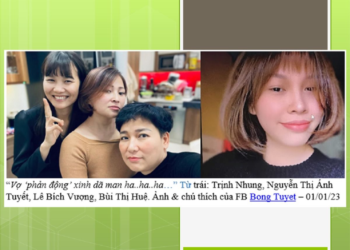 Mới cách đây không lâu, hôm 01/01/2023, FB Bông Tuyết đã đưa lên mạng hình chụp chung của chính cô và vài người bạn đồng cảnh – Trịnh Nhung, Lê Bích Vượng, Bùi Thị Huệ – cùng với lời chú thích vô cùng sảng khoái (“Vợ ‘phản động’ xinh dã man ha..ha..ha…”) rồi nhận ngay được không ít những lời lẽ tán thưởng rất nhiệt tình: