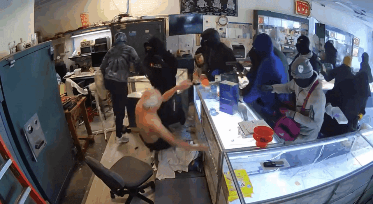 Theo video từ camera trước tiệm vàng Fine Jewelry mà NBC Bay Area có được, nhóm cướp mặc đồ đen, trùm kín đầu và mặt, xông tới trước tiệm và dùng hung khí như búa đập phá cửa kiếng phía trước của tiệm.