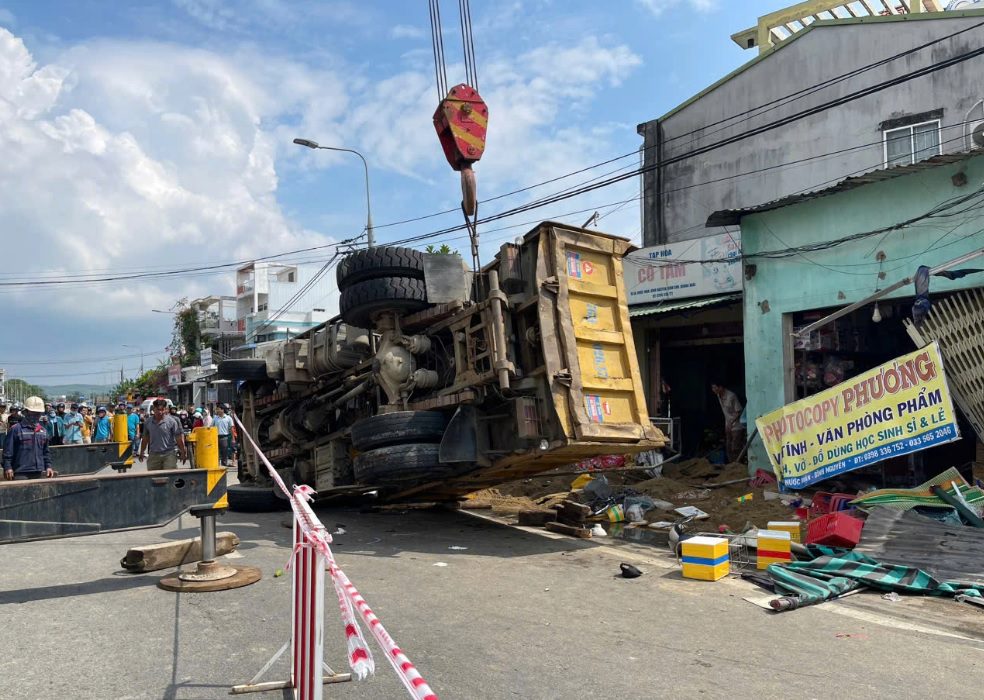 Trước tình huống bất ngờ, tài xế xe tải vội đánh lái để né xe máy. Tuy nhiên, xe tải lại va chạm 3 xe máy khác. Sau đó xe tải tiếp tục tông liên tiếp vào 3 nhà dân rồi lật, cát đổ đầy đường.