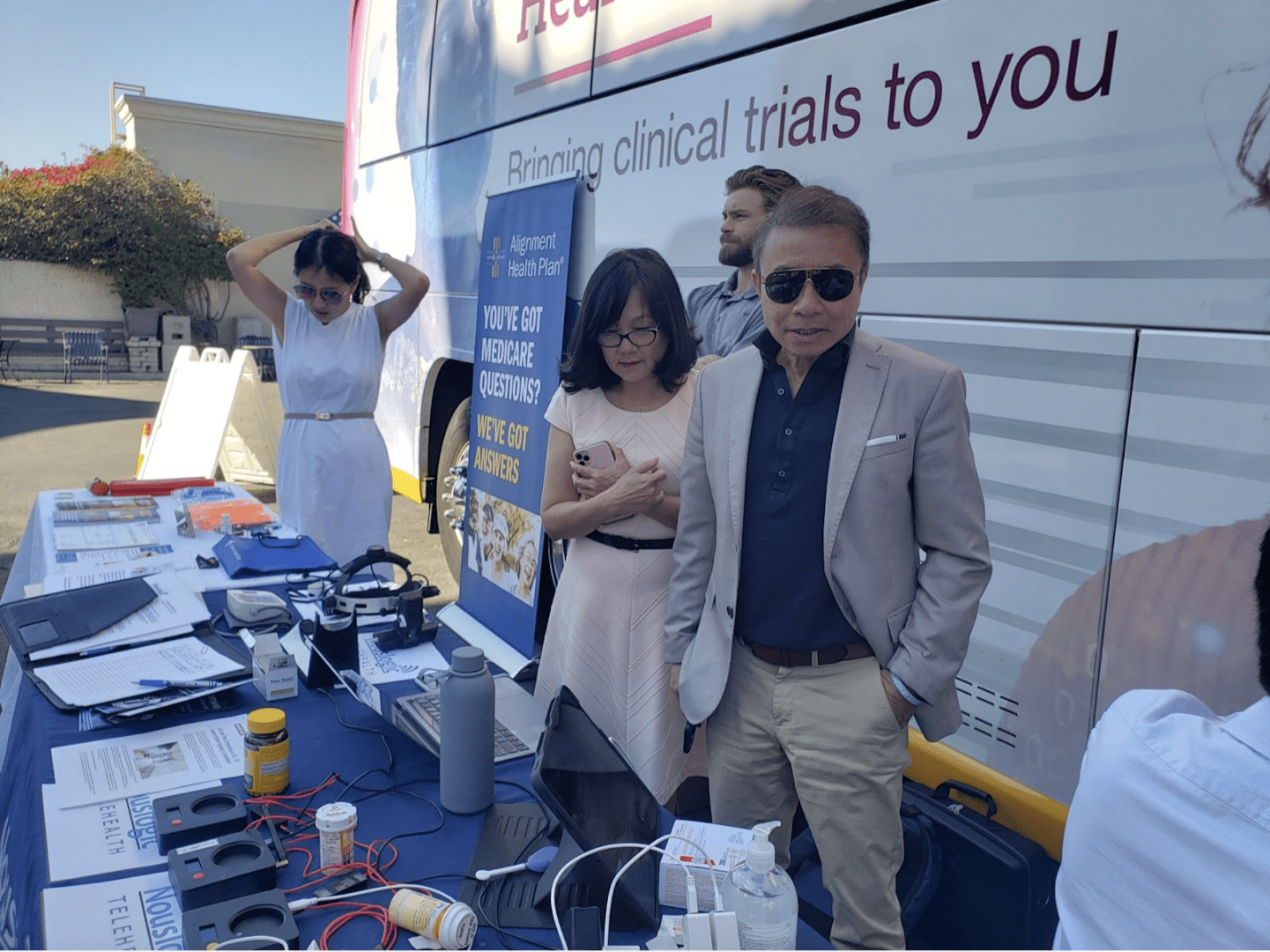 Ông Nhữ Huy Hoàng (phải) và Bác Sĩ Nhữ Thị Thục Trinh (bên cạnh) trước phòng khám lưu động ở một buổi khám bệnh cho cộng đồng Việt Nam ở Little Saigon hồi năm 2024. (Hình: Người Việt)