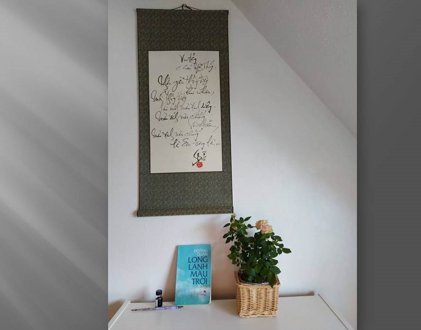 Con tôi thường tặng sách cho tôi. Bất kể, sách tiếng Việt, tiếng Anh, tiếng Đức, con tôi luôn ghi lời đề tặng bằng tiếng Việt. Tôi mân mê cuốn sách trong tay, hồi hộp mở trang đầu. Ô, đây rồi, nét chữ viết tay thương yêu của con. “Hoàng Quân tặng cho Hoàng Quân cuốn sách của Hoàng Quân.” Lời đề tặng của con có mấy chữ đơn sơ, mà tràn đầy ý nghĩa.
