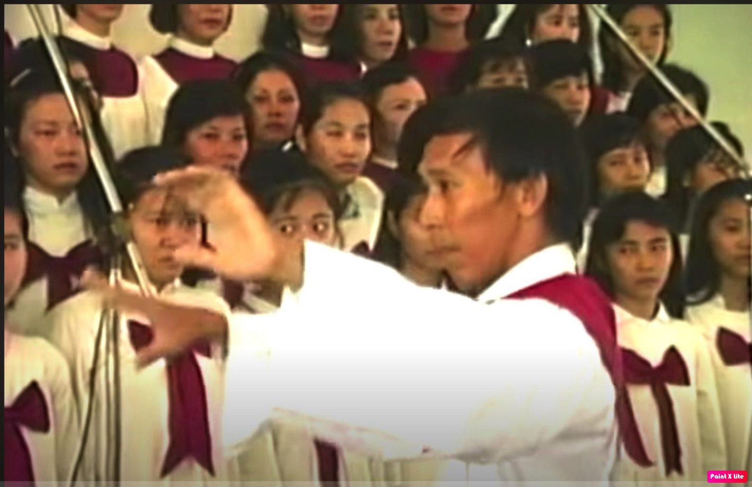 Nhạc sĩ Nguyễn Văn Thanh đánh nhịp tại Lễ Cảm Tạ 65 năm Thành Lập HT Trần Hưng Đạo July 11 1990. (Hình chụp qua YouTube “Phuoc Pham”)